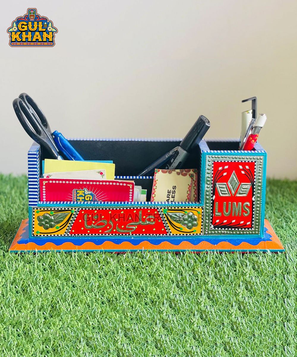 The Desk Organizers by Gul Khan are functional workspace accessories elevated through handmade chamakpatti craftsmanship. Built from wood and finished with detailed decorative work, they offer more character and visual value than standard office organizers.