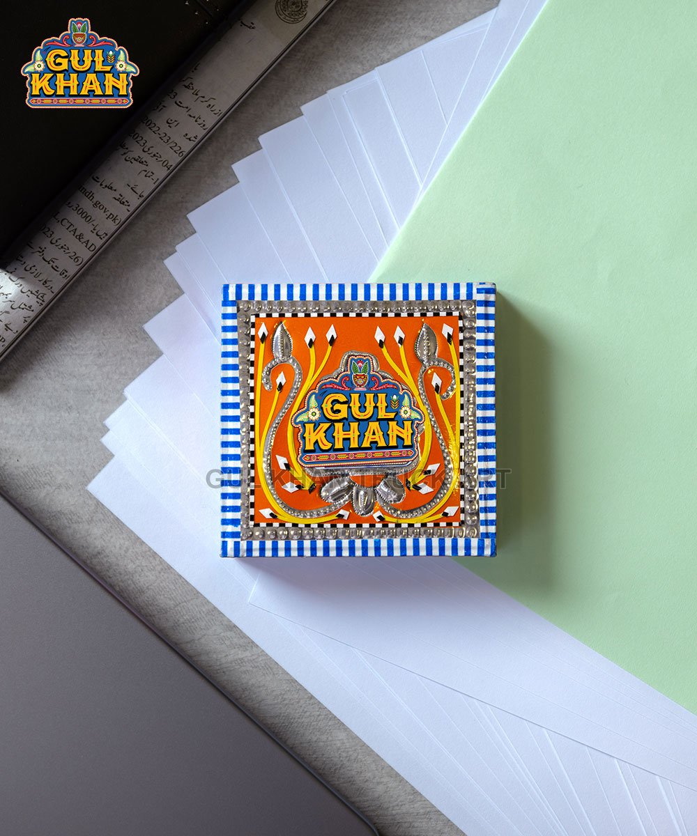 The Paper Weight by Gul Khan is a compact desk accessory that combines everyday utility with handcrafted decorative value. Made from wood and finished with handmade chamakpatti work, it turns a basic office item into a distinctive branded piece suited for desks, meeting tables, counters, and workstations.